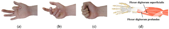 Figure 2a–c illustrate the performance of the three movements. The muscles mainly involved in such movements are the flexor digitorum profundus and the flexor digitorum superficialis, placed in the forearm, as shown in
