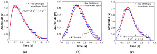 Figure 4 shows the data set of the EMG signal of each movement and the fitting curves with the corresponding mathematical models and equations. With reference to the sampling frequency, for each second, about 75 samples of the conditioned EMG signal are acquired.