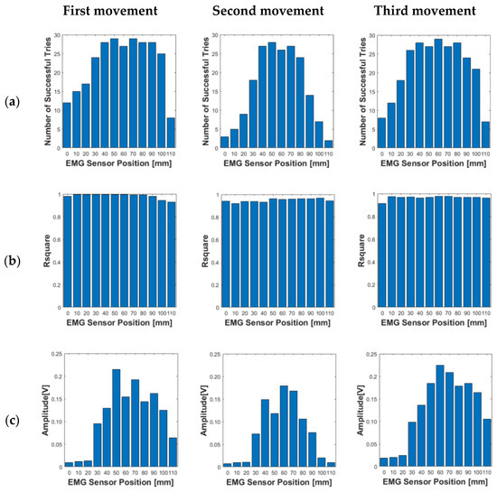 Figure 4. The range 0–110 mm has been selected for the achievement of the best position. Then, in relation to the sensor probe position and for successful trials of movement recognition, the average number of successful trials, the average R-square standard value and the average amplitude of the signal were computed.