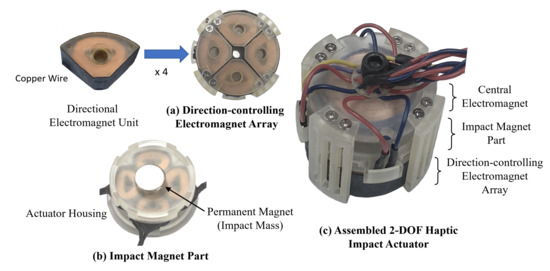 The components and assembly of the 2-DOF haptic impact actuator. (a) Direction-controlling electromagnet consisting of four directional electromagnet units. (b) Impact magnet unit where a permanent magnet creates an impact. (c) The assembly of the 2-DOF haptic impact actuator consisting of three parts.
