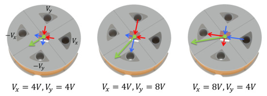 Figure 3 shows examples of the estimated magnetic field vectors by changing the voltage provided to the directional electromagnets. From Equation (2), the summation of the vector components from the positive sources (red arrows) and negative sources (blue arrows) is proportional to the magnetic field vector (green arrow) at the center of the actuator. Meanwhile, the horizontal vector component from the central electromagnet can be neglected because there is only a vertical component at the center of the actuator. Thus, the direction of the magnetic field vector at the center can be controlled by changing the voltages to the directional electromagnets. Then, the direction of the initial magnetic force applied to the permanent magnet will follow that of the magnetic field vector.