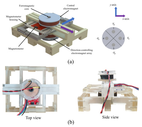 (a) Measurement setup of the electromagnetic field vector inside the 2-DOF haptic impact actuator. (b) Top-view of the direction-controlling electromagnet array with indices and voltage input.