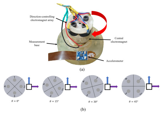 (a) Measure setup of the impact acceleration by controlling the voltage input. The 2-DOF haptic impact actuator was fixed on a measurement base with an accelerometer installed. The red arrow indicates the rotation of the impact actuator. (b) Top-view of the direction-controlling electromagnet array with indices and voltage input.