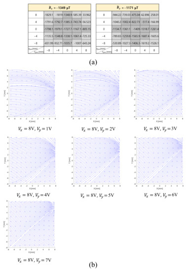 (a) Magnetic field vector measurements in x and y axes for = 7 V and = 8 V. (b) The streamline of magnetic field vector for V and = 8 V.