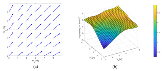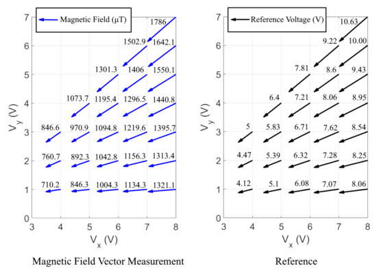 Figure 7 shows two quiver plots. The left one is for the mean magnetic field vector measurements by (, ), and the right one is for the reference voltage vector formed directly by (, ). The average angle difference between the mean magnetic field vector and the reference voltage vector was 1.72 ± 0.3. Additionally, we calculated the ratio of absolute values for the measured magnetic field vector and the largest voltage vector at = (8,7) V, denoted as = 168.02 T/V. We converted the voltage vector to magnetic field scale by multiplying by . The average difference between the mean magnetic field vector and the converted reference voltage vector was 27.97 ± 5.13 T.