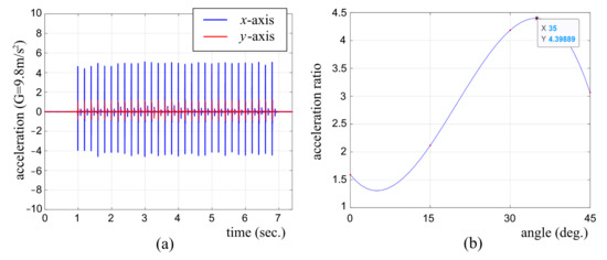 We estimated the impact angle by taking the angle where the ratio of x to y acceleration was maximum. Figure 8a shows measurement examples of x and y axes’ acceleration for , = 8 V and = 4 V. For each (, , ), the impact was created 30 times, and the ratio of the maximum acceleration in x and y axes was calculated. Then, their mean acceleration ratio was taken. As shown in Figure 8b, the angle of impact for (, ), was calculated by taking the angle of the maximum acceleration ratio. Then, the acceleration vector at (, ), was estimated from .
