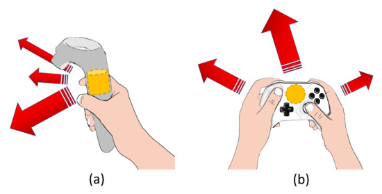 The 2-DOF haptic impact actuator can be utilized for a haptic interface providing tactile feedback to a user. It can be installed inside a haptic controller to render directional haptic cues and vibration feedback. Figure 10 shows examples of the haptic impact actuators applied to a VR controller and a gamepad. The haptic impact was found to significantly benefit the realism of virtual contact compared to a typical vibrotactile actuator [41]. Thus, the augmentation of the 2-DOF haptic impact actuator is expected to increase the immersiveness of the virtual experience felt via a haptic controller. Furthermore, the 2-DOF haptic impact actuator could effectively provide directional navigational cues to the visually impaired via a cane; most can only offer a single DOF of tactile information [42]. When miniaturized, it could be used for more diverse applications, including mobile interfaces.