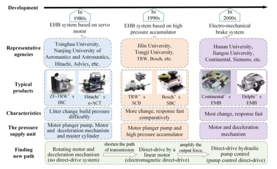 From the 1990s to the early 2000s, motor technology was still immature. To solve the requirements of high pressure and fast flow for brake systems, the EHB system, which uses a high-pressure accumulator as an energy store and energy supply device, was a solution; the system builds up high pressure by the motor plunger pump and saves in it the high-pressure accumulator in advance. The high pressure, which can provide the brake fluid at a faster speed and reduce the response time of the brake, is released when the brake starts [11]. Bosch, Advics and other companies have started to supply relevant products for Mercedes-Benz, General, Ford, Toyota and other OEMs. The electronically controlled braking system of Advics is the earliest EHB system with a high-pressure accumulator. This system cancels the vacuum booster, and the pedal is directly connected to the master cylinder [23]. TRW designed a slip control boost (SCB) brake system based on a high-pressure accumulator; it mainly consists of a new type of brake master cylinder and an electro-hydraulic control unit [14]. The same solution based on high-pressure accumulators and solenoid valves is as follows. Bosch studied a sensotronic brake control (SBC) system, which is a semi-separated structure. The accumulator saves the high-pressure brake fluid, which is provided by the pump; meanwhile, the system obtains the brake effect by releasing the brake fluid to the wheel cylinders [24]. Jin designed an EHB system, and it consists of the simulator of pedal feel, electronic control unit and hydraulic control unit. Jin’s system can achieve three different working conditions by controlling the different states of solenoid valves [25].