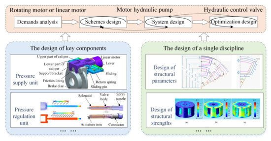 With the performance requirements of the BBW system improving continuously, the development and application of new types of BBW systems require guidance from an advanced and efficient design flow. From demands analysis to optimization designs, the designers need to adopt a variety of disciplinary knowledge from the overall consideration to make the BBW’s comprehensive index reliability, security, practicability, maintainability and other aspects meet the requirements and achieve better [33]. Among them, the design of key components and the design of a single discipline are two main factors in the design process. The diagram of the design flow is shown in Figure 2.