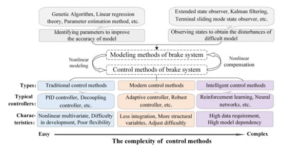 The execution control technology of the BBW system is the key to the rapid response and control accuracy of the system. An accurate model, observation of difficult model factors and the effectiveness of control methods are the research hotspots [52]. The development trend of execution control technology is reflected in: identifying the system parameters to improve the accuracy of the model, observing states to obtain the disturbances of a difficult model and combining composite control algorithms with complementary advantages of different algorithms to achieve effective compensation control. The main methods and characteristics of parameters identification, states observation and control methods are shown in Figure 3.