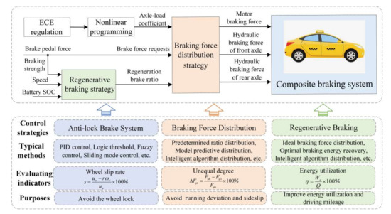 The braking system of EV is composed of two parts: mechanical braking system and regenerative braking system—composite braking for short [80]. Composite braking needs to achieve certain goals, including meeting the driver’s demand for braking force, maximizing braking energy recovery, maximizing the adhesion coefficient, meeting the driver’s demand of braking comfort, etc. Its basic starting point is to maximize the recovery of braking energy as far as possible while ensuring the dynamic performance of braking [81].