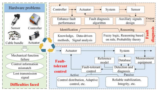 The safety of the BBW system is a key point of people’s attention. Benz’s brake fault recall and Tesla’s brake fault event further illustrate the importance of system reliability and fault-tolerant control (FTC) [97]. The difficulties, which the brake fault faced, may happen in actuators, sensors, controllers, etc. Compared with sensors, controllers, etc., the actuator fault is the main challenge that the brake system faces. When some actuators fault, the vehicle may lose its effectiveness, and the fault will be unable to meet the targets of movement control. Moreover, the ability of brake will lose efficacy, the safety of the brake will decline and other potential problems and risks may arise. Effective fault diagnosis and FTC are a method to solve the brake fault, and the characteristics and solutions of the brake fault are shown in Figure 5.
