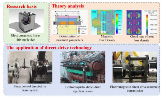 Our team designed a high power density moving-coil electromagnetic linear actuator, which is composed of some components such as external yoke, inner yoke, permanent magnets, electromagnetic coil and coil skeleton, etc. Our team applied the direct-drive technology to an automatic transmission, electronic injection device, brake system, etc., the theory analysis and application of direct-drive technology are shown in Figure 6.