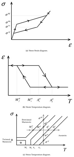 Phase diagrams, simplified in Figure 1c, show the existence of different phases, depending on temperature and stress, for a simple unidirectional loading test. Moreover, their great utility is to show the interdependence between transformation temperatures and stresses. Indeed, stress-induced phase and shape transformation begins and finishes at different values depending on temperature, and temperature-induced transformation, in the same way, is influenced by the applied stress.