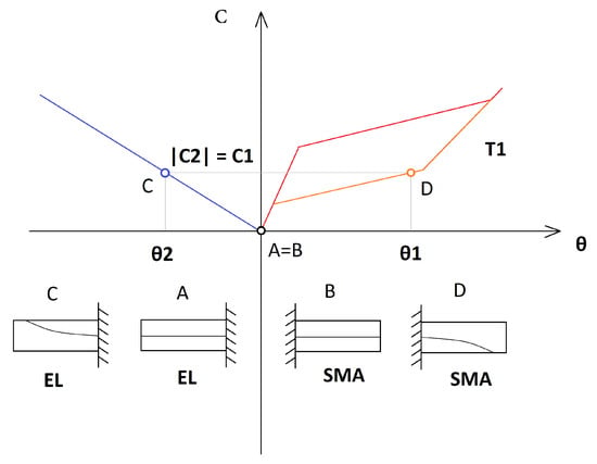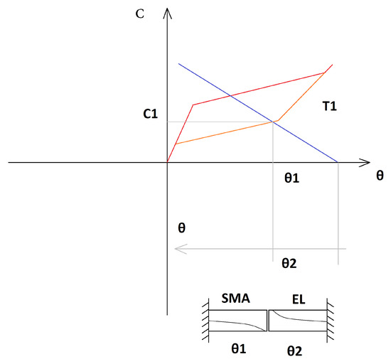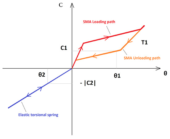 The following approach consists of a series of steps in which classical torque-angle charts are manipulated to represent SMA actuators’ behaviour more directly. Figure 2 represents the torque-angle characteristic (C and θ , respectively) for two different components in the same reference frame. In particular, the red and orange lines show a simplified SMA, exhibiting a pseudoelastic effect at temperature T 1 . In particular, red segments represent the loading path, while the orange ones represent the unloading path. The blue line, instead, shows a linear elastic response, such as that of a torsional spring. For the coupled deflection angles, θ 1 and θ 2 , the reaction torque of the two components is equal and opposite, so that C 1 = C 2 in absolute value.