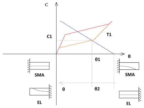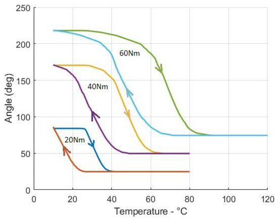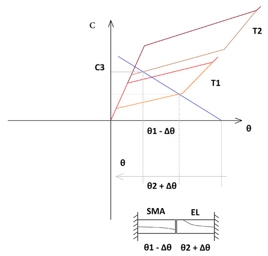 Indeed, as shown in Figure 5, the coupling of the two preloaded components constrains both of them to rotate on the same angle around the original equilibrium position, upon a perturbation. At this point, thermal-induced transformation comes into play. As temperature rises, a martensite to austenite transformation occurs. This leads to a modification in the torque-angle SMA characteristic that can be visualised as an upward and rightward translation of the hysteresis loop.