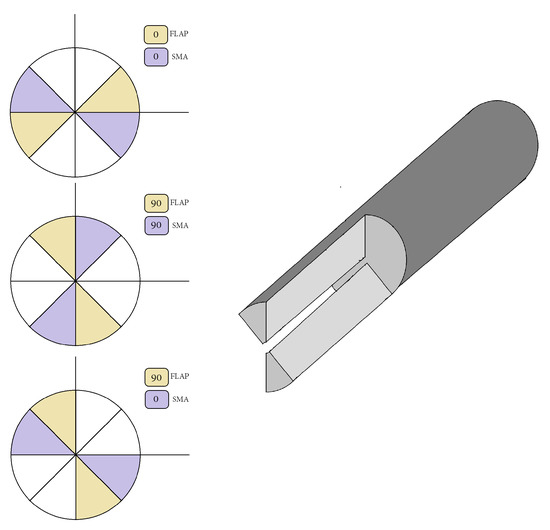 Recently, many shape memory, alloy-based actuators have been developed and patented to improve the overall performance of movable surfaces. Among others, those presented by the Boeing Company, and particularly [2,3,4,5], may be considered as the most relevant examples. Mabe et al. [2] developed an SMA actuator for movable surfaces, including locking mechanisms and a clutch or spline coupling between the driver and the driven system. This device also includes a spring, which can work together with the locking mechanism to achieve a faster actuation. Arbogast et al. [3,4] NiTinol actuator is integrated into the rotor blade as a structural element, controlling the blade twist. The active part of the actuator is composed of two parallel SMA torque tubes that simultaneously activate during each actuation. Thus, by leveraging two-way SME, it is possible to overcome the necessity for a return spring, which is needed for configurations in which stress-assisted SME is required. Moreover, thermal electric modules and a thermosyphon are used to optimise temperature management. Calkins et al. [5] developed an Adaptive Trailing Edge (ATE) consisting of a little split-flap of 2% of the local chord, which can deflect in a range between 30 degrees up and 60 degrees down. The overall apparatus is redundant for safety reasons and includes secondary components that also provide a locking and damping function. A dual-tube design is adopted to control the flap motion from a martensite to austenite transformation for both deployment and retraction via heating. This device was tested in flight on a Boeing 737–800, leading to maturation from TRL4 to TRL7.