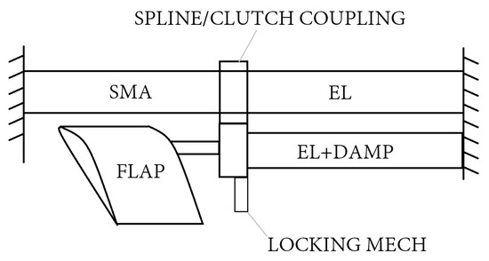 The actuator architecture is a compromise between an overall simplicity of the system and the accomplishment of real-world loading conditions. Actual actuators usually employ two torque tubes, avoiding the use of a contrast spring and thus optimizing the system weight. Moreover, leveraging on the two-way shape memory effect, both tubes can provide torque in both direct and reverse motions. However, aiming to provide a general procedure, and to keep the general architecture as simple as possible, the architecture proposed here includes an SMA torque rod and a return torque spring, which are collinearly coupled. In this way, the forward actuation exploits direct transformation ( M A ), while the backward phase transformation is assisted by the applied contrast element force (stress-assisted, two-way memory effect). To achieve real-world loading conditions, a blocking mechanism is encluded that enables the SMA component to cool down once the desired position is reached. The principal advantage of this choice is the resulting energy savings; however, even with a simple upgrade, the results are not trivial. Examples of the utilisation of this kind of devices can be found in a flap or adaptive trailing edge. With the intention of keeping operations simple, the actuator is designed to only provide movement in the forward direction, while a further damped return spring system controls the backward motion. A similar solution was implemented in [2]. To deactivate the SMA tube while maintaining an unaltered control surface position, a spline coupling system or a clutch is required. These components are essential to decouple the driving SMA rod rotation from that of the driven shaft during cool-down. In this way, upon cooling, the SMA can recover the shape associated with its martensitic phase, while the driven shaft keyed with the control surface maintains its angular position thanks to the locking mechanism. Upon locking release, the driven shaft recovers its original position. In the case of an adaptive trailing edge, in which upward deflection is also needed, the equilibrium position of the return mechanism can be set with a certain offset with respect to the hinge zero angular displacement, so that the actuator can provide either negative or positive deflections, despite always operating in the same direction. A spline assembly similar to that presented in [2] and its working scheme is illustrated in Figure 7. Two different configurations are examined, considering an architecture with and without a clutch, to decouple the driving shaft from the driven one. Figure 8 shows a schematic image of the architecture described above.