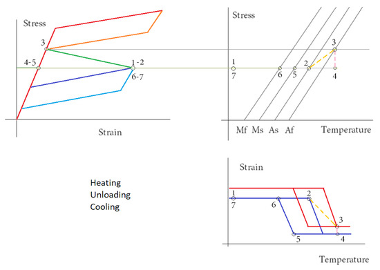 The working scheme and the graphical analysis of the actuator without clutch are reported in Figure 11 and Figure 12. Most of the transformations involved in an actuator without a clutch are the same as illustrated in the previous section. Indeed, nothing changes up to Point 3. The spline coupling allows to decouple the SMA rod backward motion from that of the driven system, however, the forward motion still remains constrained. Differently from the case presented above, upon cooling the SMA rod cannot undergo strain decreasing since the lower angular position is imposed by the flap position. Consequently, as A s σ for the point 3 stress level is reached, A M transformation begins but no strain changes can occur, since the returning force at this step is not high enough. Further temperature drop increases the martensitic volume fraction, lowering the component stiffness. As a result, stress must decrease, while strain remains constant during the 4 to 5 transformation. At step 5, the returning force is sufficient to trigger the stress-assisted two-way memory effect, so that the original shape is recovered at point 6. The following steps are not different with respect to the clutch provided actuator. In the light of this working sequence, a big concern emerges. During the transformation 4 5 according to established literature, austenite to twinned martensite transformation cannot occur in a high-stress, high-temperature region of the phase diagram as in this case. On the other hand, 4 5 transformations don’t involve any macroscopic shape recovery, thus suggesting that detwinned martensite, which is associated with macroscopic shape deformation, is not forming. Consequently, two possibilities can be found: