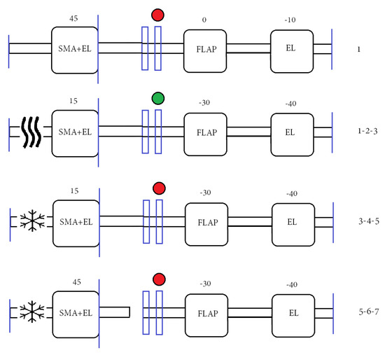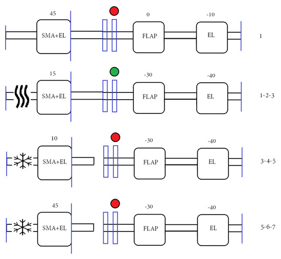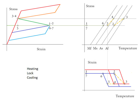 At this point, it is possible to examine the working scheme and the expected response of the SMA rod during actuation. All the steps are enumerated coherently in Figure 9 and Figure 10, which represent a simplified schematic of the actuator. Note that the numbers presented on the top of each box represent a hypothetical angle of deflection for the related assembly, while the red and green dots represent an activated or de-activated locking mechanism, respectively. Moreover, a continuous rectangle between the “SMA+EL box” and the rest of the system represents a disengaged clutch (the systems are coupled); meanwhile, a discontinuity between the two of them represent that the clutch is engaged (the systems are decoupled). Point 1 represents the initial equilibrium condition between the SMA rod and the driven system, represented by the green line. Upon heating, before reaching A s σ (which indicates the temperature intercepted on the A s line for a given stress σ . This kind of notation will often be reported hereafter); no significant changes can be appreciated on the stress–strain diagram (Point 2). Further temperature increases, beyond A s σ induce the martensite-to-austenite transformation, resulting in the original shape recovery. Consequently, from point 2 to 3, the SMA rod angle and strain decrease following the load line equilibrium condition. This means that the 2 3 transformation induced by temperature rise undergoes a variable load. The yellow shaded lines in stress-temperature and strain-temperature diagrams are hypothetical paths based on the expected starting and finishing equilibrium points. Note that point 3 also represents the SMA rod’s angular position at the end of the forward actuation. At this step, the locking system is activated to hold the flap in position, and the clutch is engaged, enabling the SMA rod to cool down and return to its martensitic phase. As the driver and driven systems are decoupled, the overall torque applied to the SMA drops down to the horizontal load line, as shown in points 3 and 4. Simultaneously monitoring all three charts, it is evident that temperatures remain constant, and stress decreases as well as strain, following the high-temperature SMA characteristic. Again, the 3 4 loading path on stress–strain and strain-temperature diagrams are based on starting and finishing equilibrium points. Cooling the SMA rod down to M s σ does not involve any macroscopic stress–strain change, as shown in points 4 and 5. Further decreases in temperature trigger the stress-assisted shape memory effect. The transformation ends on Point 6 as M f σ is reached. Strictly speaking, cooling down the SMA from point 6 to 7 under constant torque should induce a further increase in the rod strain, moving to the 100% martensite characteristic. Still, to simplify this dissertation, it can be assumed that Points 1 and 7 are sufficiently close to M f σ so that no macroscopical effects can be observed.