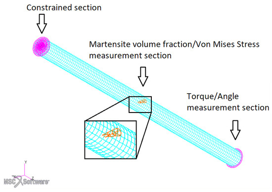 The conceptual design based on the graphical analysis was validated, creating original models using MSC Patran and Nastran (v2017.1), which adopts Auricchio’s formulation [15,16]. Specific criteria drove their realization. These include the non-linearity of the elements, to support the constitutive law of the SMA, and the number of elements along the radius, to adequately describe the stress–strain–martensite phase behaviour within the cross-section.
