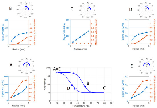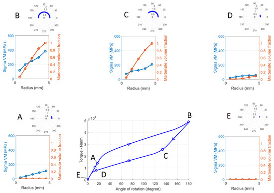 The Martensite volume fraction was considered in the element centroid to avoid physically meaningless results, as in the grid points to higher figures than those that emerged due to data interpolation. Moreover, to reduce border effects, elements in the mid-section along the length of the rod were considered, as shown in Figure 15. The stress was considered in the same points to match the radial position of the two quantities involved in this discussion. A polar diagram of the angular displacement is reported to visualise the rod’s motion. Note that the radial value is normalised to one, and does not refer to any physical quantity. Figure 16 and Figure 17 show some snapshots of the mechanical and thermal cycles, respectively.