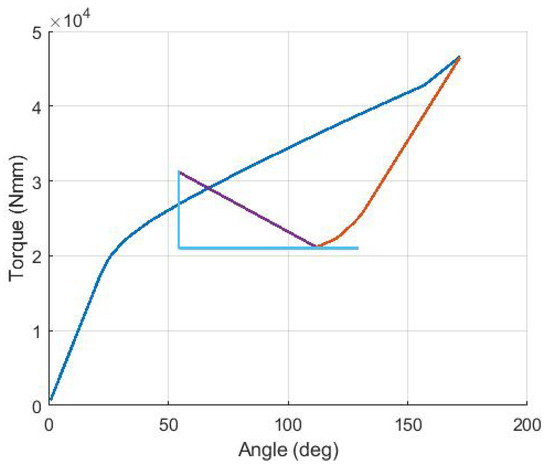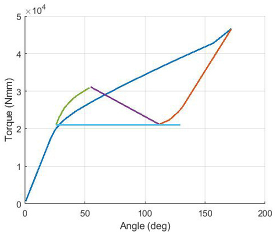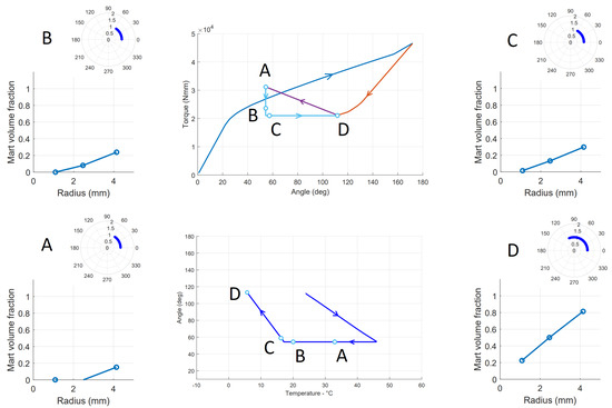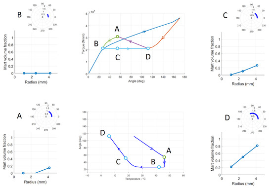 The three charts mentioned above can be manipulated and combined into what will be referred to hereafter as the actuator’s diagram. First of all, it is interesting to note that the torque-angle characteristic of SMA tubes and rods shows a similar behaviour with respect to the stress–strain diagram under unidirectional loading. Similarly, the angle temperature response recalls that of the strain-temperature, again showing a hysteresis loop. It is important to underline that, in rods subjected to torque loading, the transition between austenite and martensite begins in the outer section of the component, where the stress is higher, and subsequently spreads toward the inside of the same, so the linear segments of the hysteresis loops should be replaced by smoother curves in both torque-angle and temperature-angle diagrams. Moreover, the stress in the inner core along the radius of the specimen will never be high enough to trigger the austenite-to-martensite transformation. As a result, for torque rods, the lines referred to in the 100 % martensite phase actually represent an asymptote. Experimental data on the thermal and mechanical cycle of torque SMA torque tubes can be found in [12,13]. To provide a more intuitive representation of the phenomena under investigation, the diagrams illustrated below are represented as those referring to a unidirectional loading case. Moreover, because stress varies with the radius in a rod subjected to a torsional load, the applied torque will be reported instead of stress to avoid ambiguity. The actuator’s diagram is built beginning from the torque-angle field.