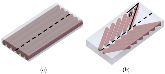 A bundle actuator consists of multiple McKibben fluidic artificial muscles (FAMs), where individual FAMs are referred to as “fibers”, and the complete bundle actuator is referred to as a “muscle”. Fibers in a pennate topology are arranged at an angle to the direction of muscle bundle motion. The fibers in a pennate muscle are subject to axial contraction, radial expansion, and rotation upon actuation. A special case of fibers with zero pennation angle is also recognized as the parallel topology. The critical difference in this zero pennation angle configuration is that the fibers will only contract axially and expand radially, but not rotate. Each muscle topology in this analysis is considered as a single-layer, two-dimensional array of fibers. All fibers have the same initial braid angle . The fibers in the pennate topology are assumed to be symmetrically oriented in a bipennate arrangement. Figure 1 is a visual representation of the two muscle topologies under consideration. Figure 1a illustrates the special case zero pennation configuration or parallel fiber topology, and Figure 1b shows the bipennate fiber topology. Similar schematics of this pennate arrangement originate as far back as 1664 from functional biomechanics models []. The fibers are represented as red cylinders.
