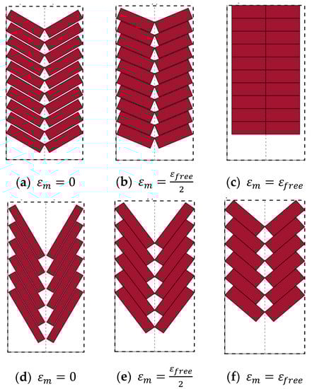 This section details a method to determine the set of fiber parameters based on a prescribed initial pennation angle in this muscle bundle design. The initial pennation angle in combination with the fiber contraction behavior will dictate the fiber behavior during muscle contraction. The fibers in the topology can be contraction-limited, rotation-limited, or both at free contraction of the muscle. If the configuration is rotation-limited, it indicates that the fibers are not capable of reaching their full contraction potential, but will reach full rotation. Therefore, the pennation angle at free muscle contraction , as shown in Figure 3a–c. If the configuration is contraction-limited, it indicates that the fibers are not capable of reaching full rotation, but will reach their full contraction, as illustrated in Figure 3d–f. Therefore, a contraction-limited configuration will have and the fiber braid angle at free contraction , where is the fiber braid angle corresponding to the maximum attainable fiber contraction at a given pressure. If the configuration is both contraction- and rotation-limited, it indicates that the fiber will reach full contraction and full rotation simultaneously, and thus and .
