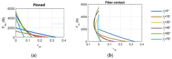 Muscle force–muscle strain behavior of parallel () and bipennate muscle bundles with pinned boundary condition (a) and fiber contact boundary condition (b). The legend shown on the far right indicates the fiber pennation angle of the muscle topology.