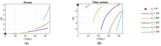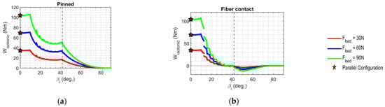 Figure 9 shows how the transmission ratio varies with respect to fiber pennation angle for different fiber boundary conditions. In the parallel topology, the muscle contraction rate and fiber contraction rate are equivalent (i.e., ), because no fiber rotation occurs. The transmission ratio for the parallel muscle topology is shown as a red star marker. A transmission ratio greater than one indicates that the muscle topology amplifies fiber contraction; a ratio less than one indicates that topology reduces contraction. Figure 9 shows that, for all bipennate muscles, the transmission ratio increases as the pennation angle increases. The rates of change of transmission ratio with pennation angle observed here differ from that previously reported for bipennate bundle actuators with fixed fiber geometries, due to the spatial constraint on muscle envelope and the corresponding fiber sizing considered here [,]. The pinned fiber boundary condition analysis shows that all bipennate muscle topologies considered producing transmission ratios greater than 1. For bipennate muscles with fibers in contact, both positive and negative transmission ratios are observed, and ratios are generally less than 1. The negative transmission ratio values align with the elongation behavior observed in bipennate muscles, with the fiber contact boundary condition that was seen in Figure 5b and Figure 6b. Knowledge of bipennate variable gearing and muscle force-strain space gives insight into matching muscle output demands of speed or force for a broad range of movements. Although some have explored the load dependences of muscle-like soft actuators with unipennate structures, their study enables the spatial bound of the actuator to change. Thus, their results were only able to isolate the dependence of the pennation angle and number of contractile units on the architectural gear ratio (AGR) []. The equal spatial envelope constraint imposed in the analysis presented in this paper allows for a fair and direct comparison between configurations, as well as providing practical insights into which pennation configuration is best to accomplish their design goals, and what tradeoffs exist when using a pennate configuration, to optimize a certain actuation characteristic at the expense of others.