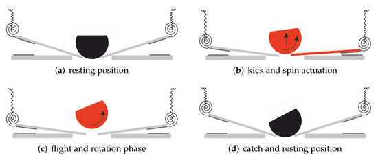 (a) Resting position: The sphere remains in stable rest position. (b) Kick and spin actuation: The sphere is transferred into a free flight phase, while a torque is transmitted to set it in rotation by asymmetric actuation. (c) Flight phase: The sphere is not in contact with the beams and rotates freely into the desired direction. (d) Catch and resting: The sphere lands in a deflected position and is kept in a stable position.
