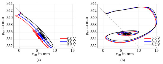 In order to choose the inputs for the electrostatic actuation, it is useful to understand the behavior of the beam-sphere interaction when applying a voltage to the actuators. Initially, the sphere is on top of the beam tips, which are bent downwards and are in contact with the insulated ground plate due to the sphere mass. If we now apply identical voltages to the actuators, the electrostatic forces pull the actuators’ rear ends in direction of the ground plate. Due to the leverage effect, the beam tips push the sphere upwards. Since the electrostatic forces increase quadratically with the voltage according to (7), the force transmitted to the sphere also becomes larger with higher inputs. This is shown in Figure 4. The parameter values used for this and the remaining simulations are given in Appendix A.3.