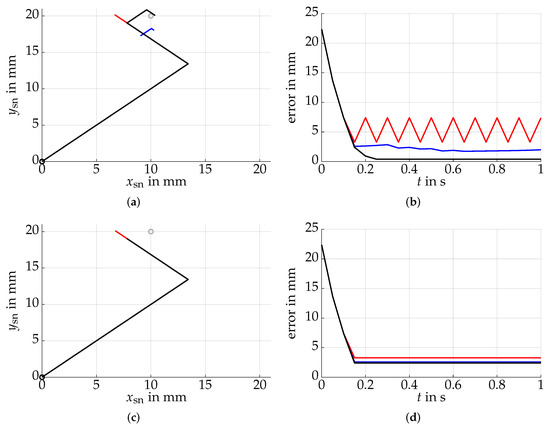 The basic (red), extended (blue), and pre-learned extended (black) controllers are now applied to the same setpoint problem, but the kick directions do not coincide with those of the ideal model (a) The basic controller now oscillates in two dimensions, while the extended controllers quickly adapt to the new kick directions. (b) The error decreases slower than in case of the ideal model for all controllers, but a similar number of steps is needed for the extended controllers to converge to the desired position.