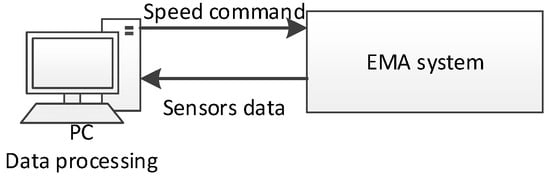 where the subscript denotes the steady state, that is, the speed is the data measured at a constant speed. It can be seen from Equation (4) that we can measure the armature current to obtain the friction torque. The test bench is shown in Figure 4. The test bench consists of a PC and the EMA system. The PC is used to send commands to the EMA system and receive the sensors’ output from the EMA system. Then, the PC processes the data to identify the friction parameters.