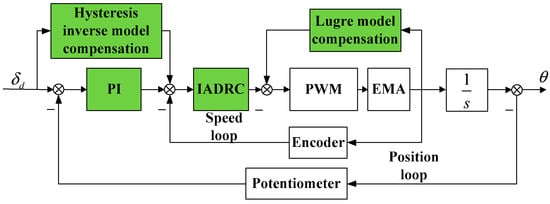 The control block diagram of the EMA system is illustrated in Figure 7. Improved ADRC is used for speed loop control and LuGre model compensation, and Hysteresis inverse model compensation is utilized for controller design. Both of them comprise the compound controller. Friction compensation is carried out by feedback. Backlash compensation is based on the idea of inverse compensation by feedforward.