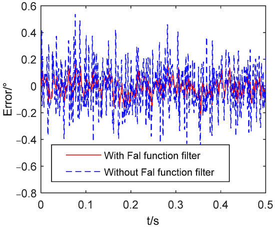 A comparison of unit step response with band-limited white noise power of 0.003 between the system with the filter and the system without the filter is executed to validate the performance of the Fal function filter. The filter parameters are: k = 1000, δ = 0.8, α = 0.5. Figure 10 shows the error comparison for the filter performance. The standard deviation of the error between the reference input and the actual system output are 0.1721° and 0.0612°, respectively. The result shows that this Fal function filter has a good performance of state tracking for the system with noise.