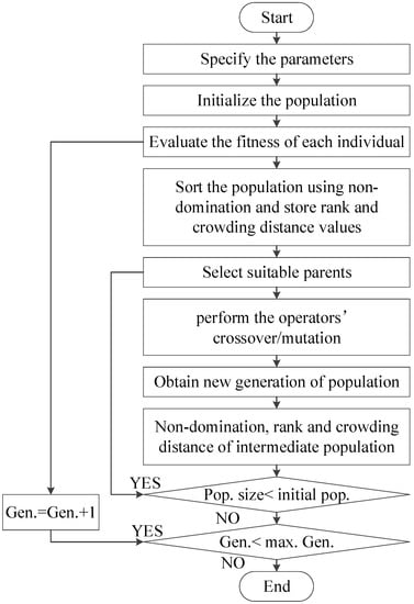 The NSGA-II is an improved approach of the genetic algorithm (GA) for the multi-objective optimization of process responses. Non-dominated solutions of NSGA-II have high crowding distance, which are used to provide diversified Pareto optimal solutions. A Pareto optimal solution cannot be improved with respect to any objective without worsening at least one other objective []. The set of feasible non-dominated solutions in the solution space is referred to as the Pareto optimal set. The NSGA-II encompasses advanced concepts like elitism, fast non-dominated sorting, and diversity maintenance along the Pareto optimal front. The flowchart of the NSGA-II is shown in Figure 11.