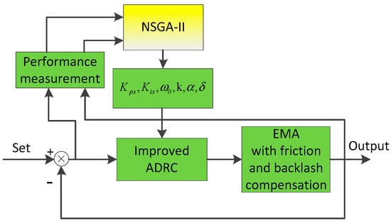 A proportional integral derivative (PID) controller is usually used to control the EMA system, but considering the nonlinear characteristics of the EMA system, the traditional PID controller has disadvantages. Because of this, many scholars put forward different control strategies for the EMA system. In [,], a sliding-mode variable structure controller is proposed to improve the dynamic characteristics. However, it has the problem of chattering. In [], the Genetic algorithm (GA) optimized fuzzy supervisory PID controller is adopted in the EMA system. Since the rules of a fuzzy controller consist of an antecedent part and a consequent part, it is difficult to define the fuzzy rules. In [], an inner-loop control strategy is implemented in the electromechanical actuator. Each of the proposed methods has different models and assumptions, which cannot be applied easily to other cases, and some trade-off is necessary to achieve the performance. It is essential to improve the controller to achieve better performance.