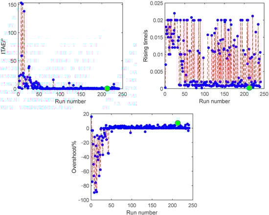 The objectives include overshoot, integrated time and absolute error (ITAE), and rise time. Overshoot and rise time are performance indexes of step response, and they are chosen as objectives to be minimized. ITAE as an optimal controller index is regarded as an objective to be minimized. According to the control strategy, the improved ADRC has the following input parameters: , , , , , . The multi-objective optimization problem is posed in Equation (14).