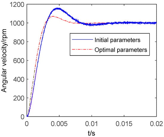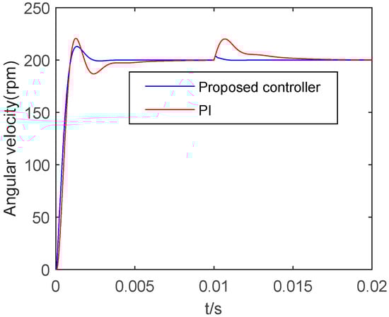 To validate the disturbance rejection ability, a step signal with an amplitude 200 rpm is set as the input of the system. A step disturbance is also added to the system at 0.01 s. The response curve is shown in Figure 16. It is seen from Figure 16 that the rise time and overshoot by the proposed controller are shorter than the conventional PI controller. The peak value and the tuning time of the disturbance by the proposed controller are better than the PI controller. It can be seen that the proposed controller can effectively improve the anti-disturbance ability of the system, on the premise of ensuring the dynamic characteristics of the system.