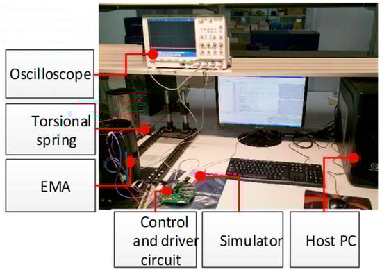 As discussed in the preceding section, the PI controller and the proposed compound controller are applied to the EMA system. The sample time is 1 ms, and the controller is carried out on a Digital Signal Processing chip (DSP). The experimental facility of the EMA system is illustrated in Figure 17. A host PC is used as the upper computer to record and monitor the system in real time. The simulator is used to download the program to the DSP. The torsional spring is used as the load torque of the EMA surface. The oscilloscope is used to monitor the output of the digital signals.