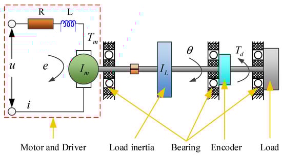The symbols in Figure 1 are defined as follows: is the armature inductance of the motor, is the armature resistance, is the armature current, is the armature voltage, is the back-electromotive force (back-EMF), is the moment of inertia of the motor rotor, is the moment of inertia of the disk, is the motor torque, is the friction disturbance torque and is the angular of the shaft.