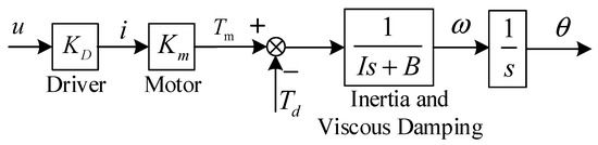 Generally, the driver is set in the current mode and the bandwidth of the current loop is much higher than the bandwidth of the speed loop (more than ten times). Therefore, the current loop can be viewed as a proportional element, i.e., , where is the conversion factor of the driver. Hence, the DDCs model can be simplified as shown in Figure 2.