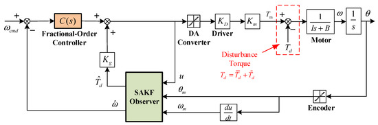 As shown in Figure 3, the fractional-order controller is used to eliminate steady-state errors caused by . For and measurement noise, an SAKF observer is configured to track the residual perturbation by collecting the input voltage , feedback angular velocity and feedback angular .Then, the estimated disturbance after a coefficient is added to the input voltage through feedforward and the filtered angular velocity is used for speed feedback control.