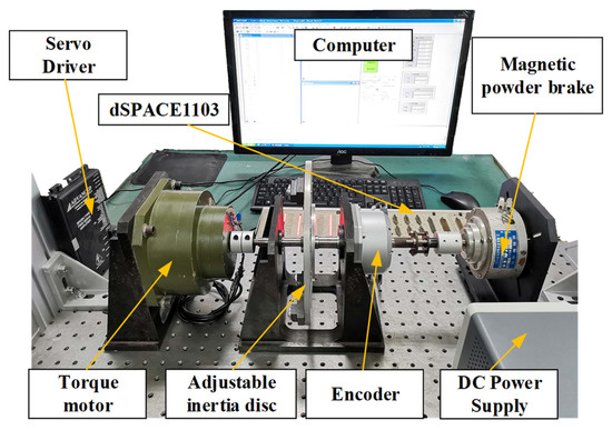 The experimental device is mainly composed of a BLDC, a servo driver, an adjustable inertia disk, an encoder, a magnetic powder brake, a dSPACE1103 and computer as shown in Figure 4. The inertia plate is used to simulate load inertia and the external disturbance is applied by the magnetic powder brake. The rotational speed of the shaft is measured by an incremental encoder. All the required parameters are provided in Table 1.