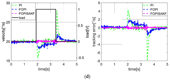 From the above experimental results, it can be seen that, compared with the traditional PI controller, FOPISAKF controllers achieve an improvement of 80.58%, 66.41%, 46.62% and 89.34%, respectively. Hence, the FOPISAKF controller can not only improve the tracking accuracy of the system, but also enhance the disturbance suppression ability.