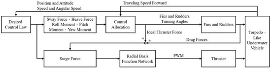 The main design target of this investigation is to develop effective control allocation methods which can precisely and optimally convert the desired control law in Equation (1) into installed actuators’ inputs. The overall control allocation procedure for the studied torpedo-like underwater vehicle is illustrated in Figure 2. From Figure 2, it is easy to find out that the proposed method integrates optimal control allocation methods and a transformation of input and output commands of the installed actuators to generate applicable turning angles and PWM (pulse-width modulation) signal based on the H∞ control law to drive the torpedo-like underwater vehicle to precisely track desired trajectory .