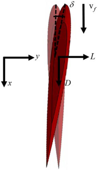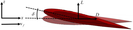 where L is the lift force of fins or rudders, D is the drag force of the rudders, ρ stands for the density of the water, A means the reference area of fins and rudders, and vf is the flow velocity relative to fins or rudders, and in the underwater vehicle case, it usually means the traveling speed of the vehicle, or linear velocity along the x-direction. It is clear that the fins and rudders need flow velocity or traveling speed to generate forces. CL and CD stand for the lift coefficient and drag coefficient, which could be measured through experiments, and δ is the attack angle of fins and rudders. The schematic diagrams of the fin and rudder operations are shown in Figure 3 and Figure 4 as follows.