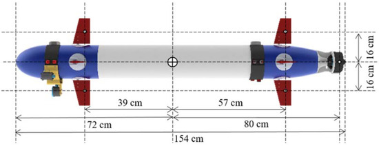 The following figures show the prototype of the torpedo-like underwater vehicle developed and named “AUV Lab 611” by the Autonomous Vehicle Lab of National Cheng Kung University, which aims to perform underwater missions. This underwater vehicle contains one fixed thruster and one pair of fins and rudders at the stern, and one pair of fins and rudders near the bow.
